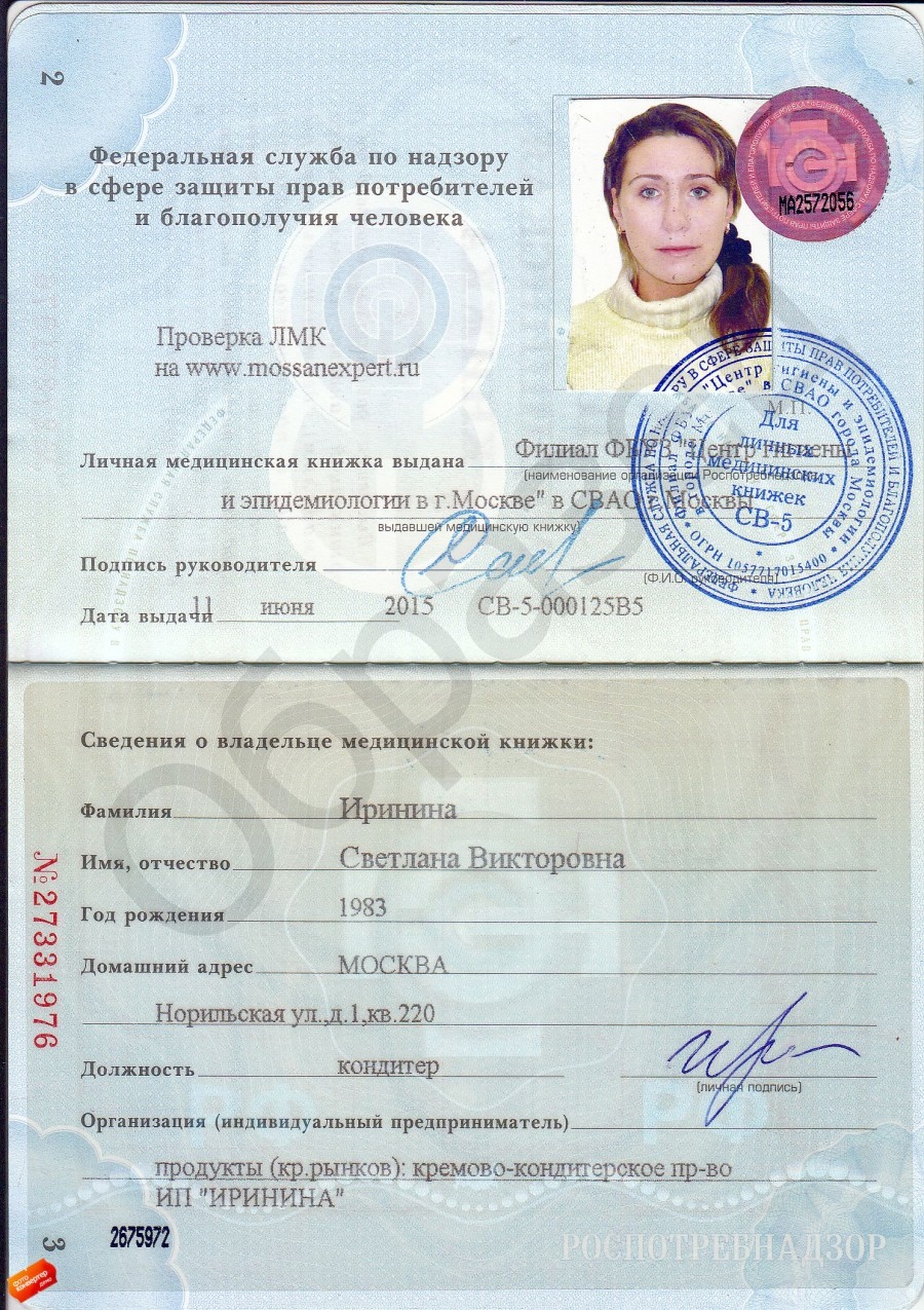| Назначение | Продление срока действия имеющейся медицинской книжки |